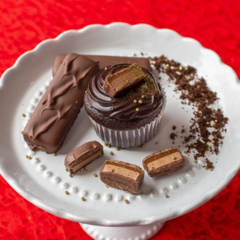 El clásico. Cupcake cremoso de chocolate relleno de Milky Way y topping de ganache de chocolate. Tip: Mete al horno por 10 segundos tu Cupcake de Milky Way y acompáñalo con una bola de helado de vainilla.