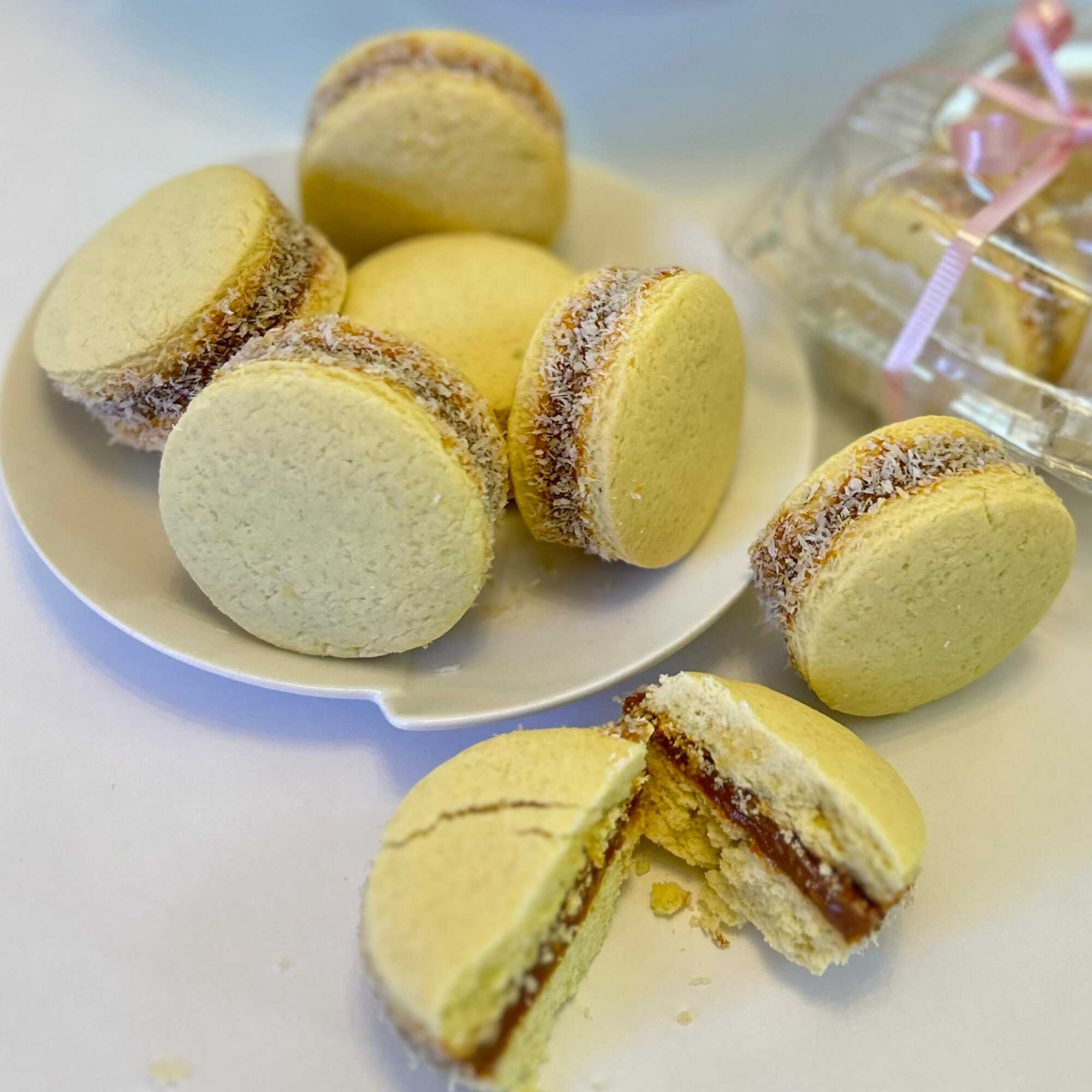 Galletas suaves y delicadas, rellenas de dulce de leche y cubiertas con ralladura de coco