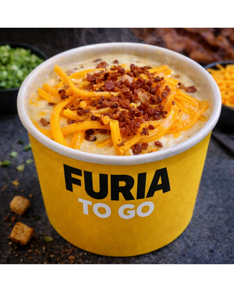 Sopa de papa cremosa, con un toque de queso cheddar y tocino crujiente
