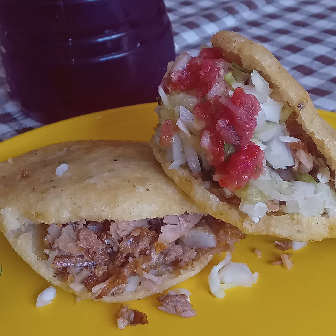 Gordita de Maciza, acompañado de repollo, cebollita curtida, salsa roja, salsa verde y limones.