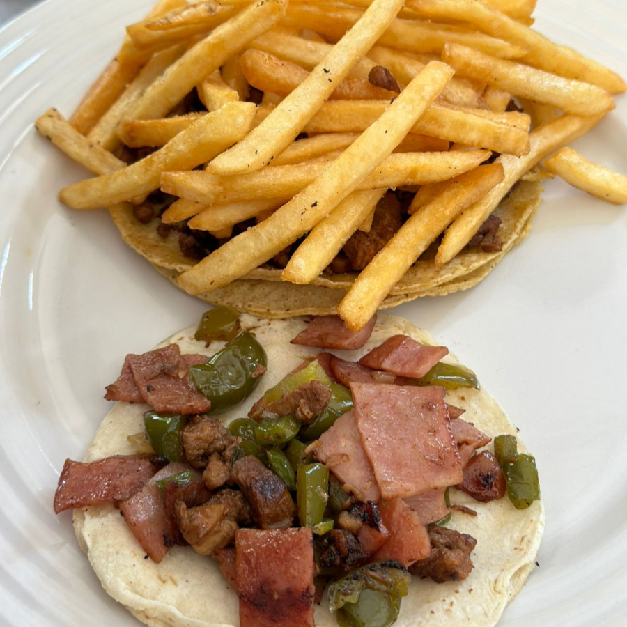 Tortilla de harina de maíz, carne, ( cebolla y cilantro) y salsa de la casa y porción de papas fritas.
