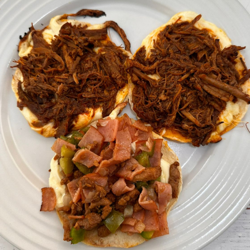 Tortilla de harina de maíz, carne, ( cebolla y cilantro), queso blanco y salsa de la casa.