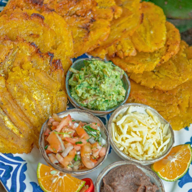 Deliciosas tostadas de plátanos verdes, acompañadas de frijolitos, queso, guacamole y ají picosito, ideal para parcharse entre amigos