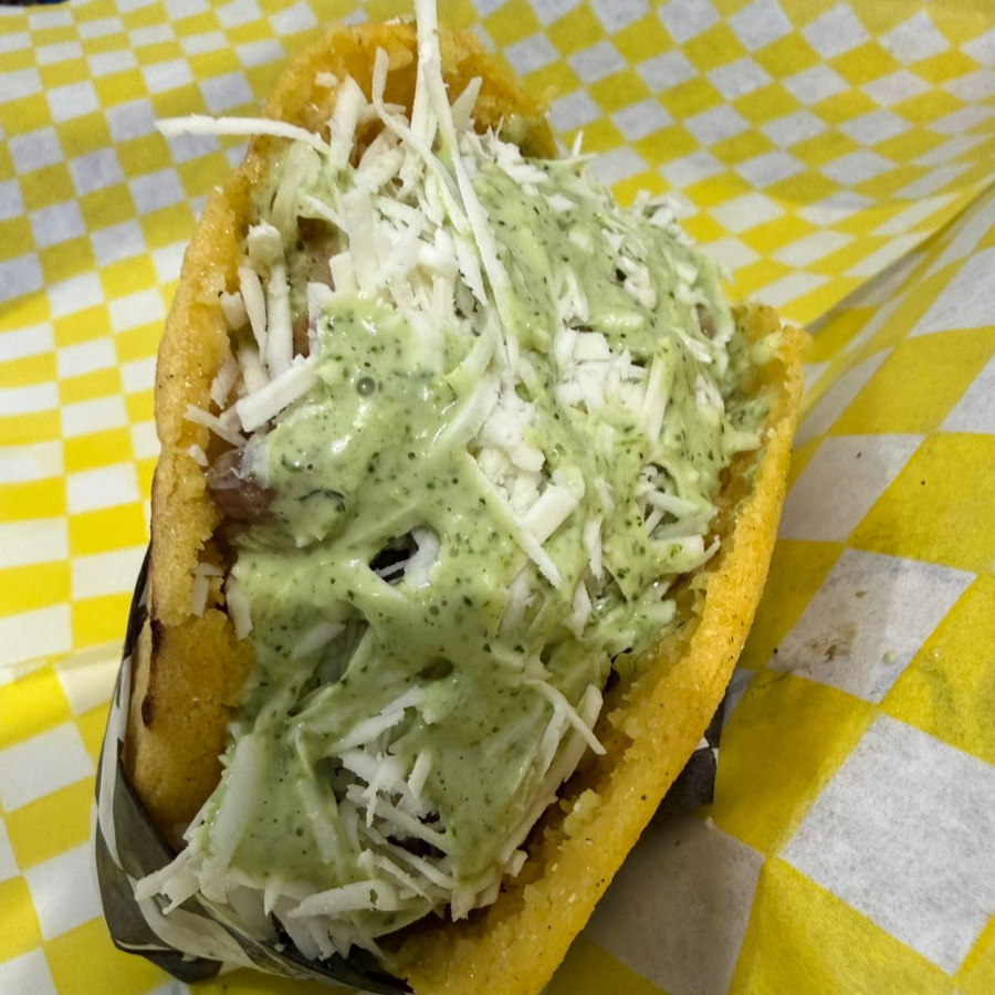 Delicioso pan de maiz doradito por fuera y esponjoso por dentro, rellenita con queso derretido y un mix de diferentes y jugosas carnes