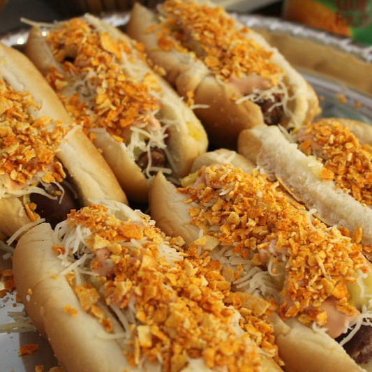 Pan suave y recién tostado que abraza una salchicha jugosa y perfectamente dorada. Encima, una explosión de sabores: crujientes papitas trituradas, queso rallado que se derrite con el calor y toques de piña.