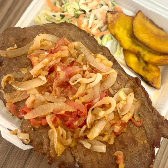 Jugoso bistec de res condimentado con tomate, acompañado con una base de arroz, ensalada de la casa, plátanos fritos y saborcito colombiano