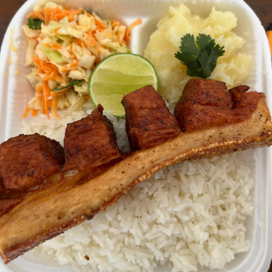 Crujiente chicharrón de cerdo, condimentado con sabor colombiano, acompañado de arroz, puré de papa y ensalada