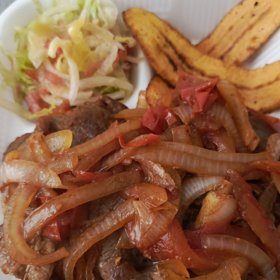Delicioso bistec de res asado y condimentado con todo el sabor colombiano, acompañado de una base de arroz, platanos maduros fritos y ensalada