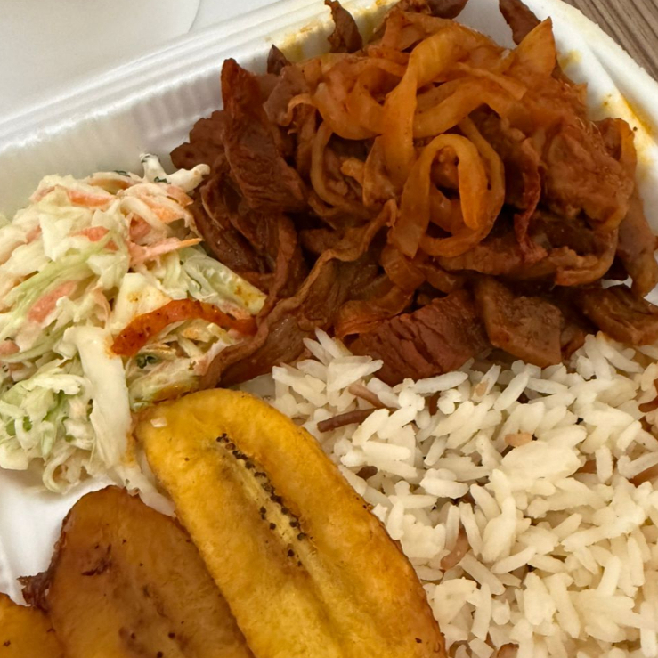 Jugoso bistec de cerdo asado y condimentado con el sabor colombiano de nos caracteriza, acompañado de una cama de arroz, ensalada de la casa y plátanos maduros fritos