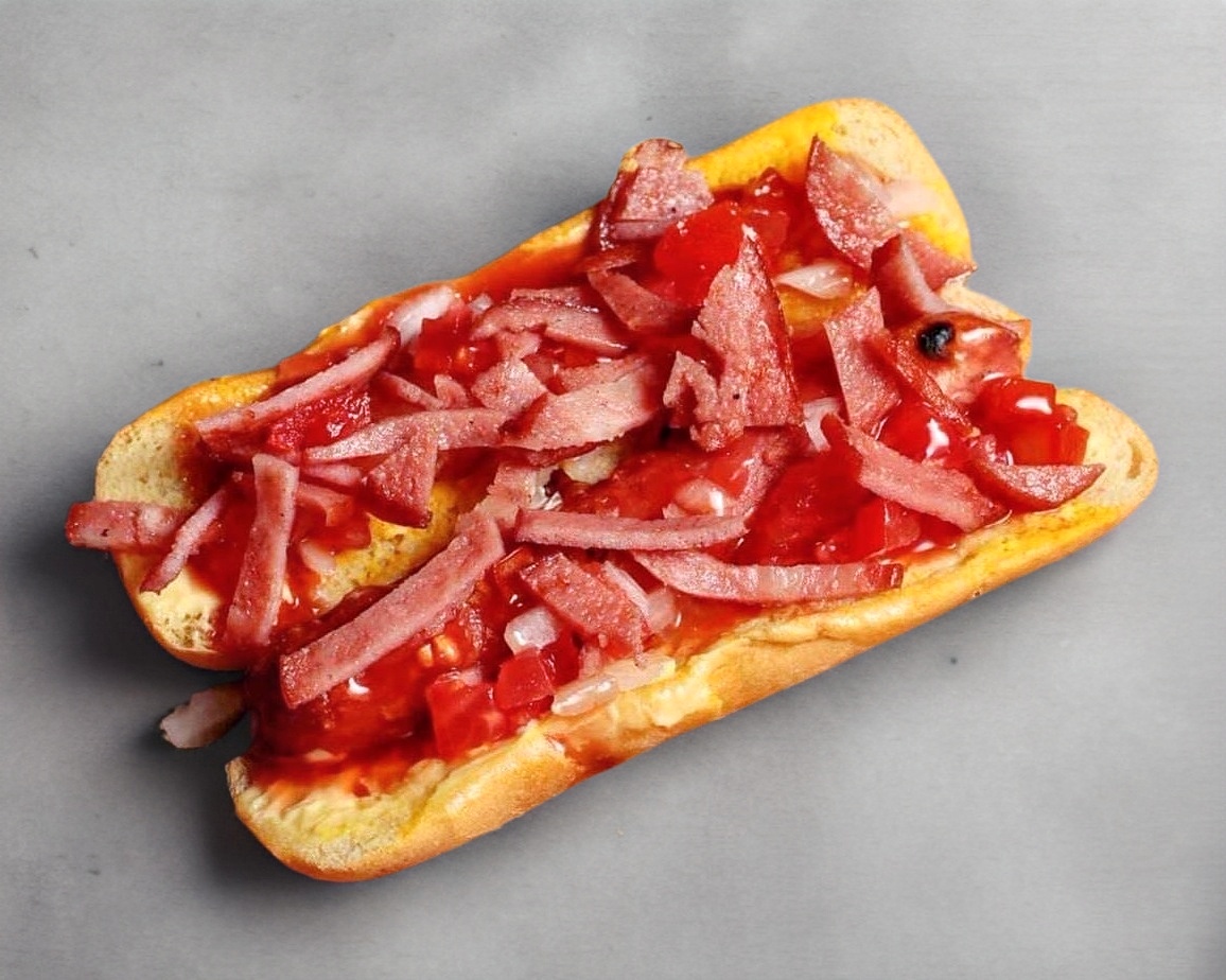 Mayonesa, mostaza, salchicha al carbón, tomate, cebolla, tocino y cátsup.