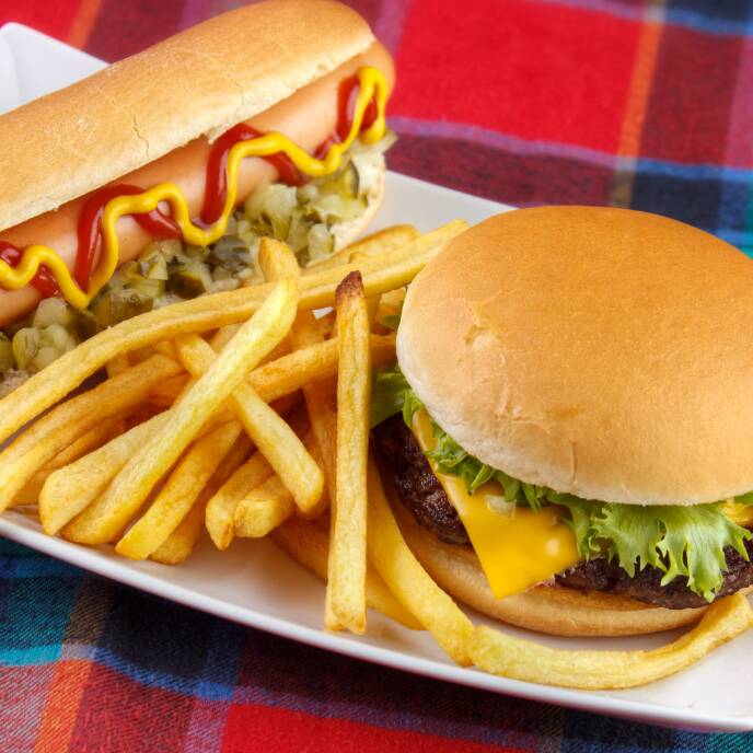 Hamburguesa clásica, Hot dog clásico y papas fritas.