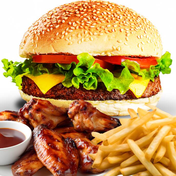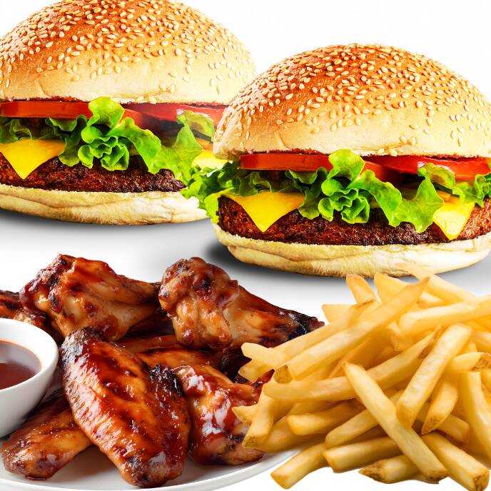 Hamburguesa clásica, hamburguesa choriqueso, 6 alitas BBQ, papas fritas y 6 salchipulpos