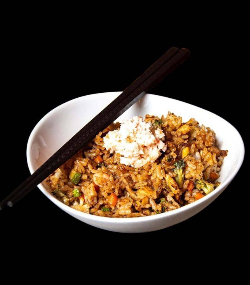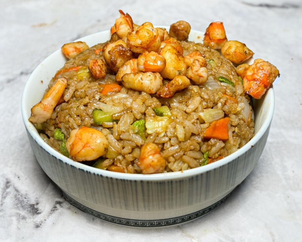 Arroz frito con verduras (brócoli, zanahoria amarilla, naranja y coliflor). Pollo, res y camarón sazonado con soya.