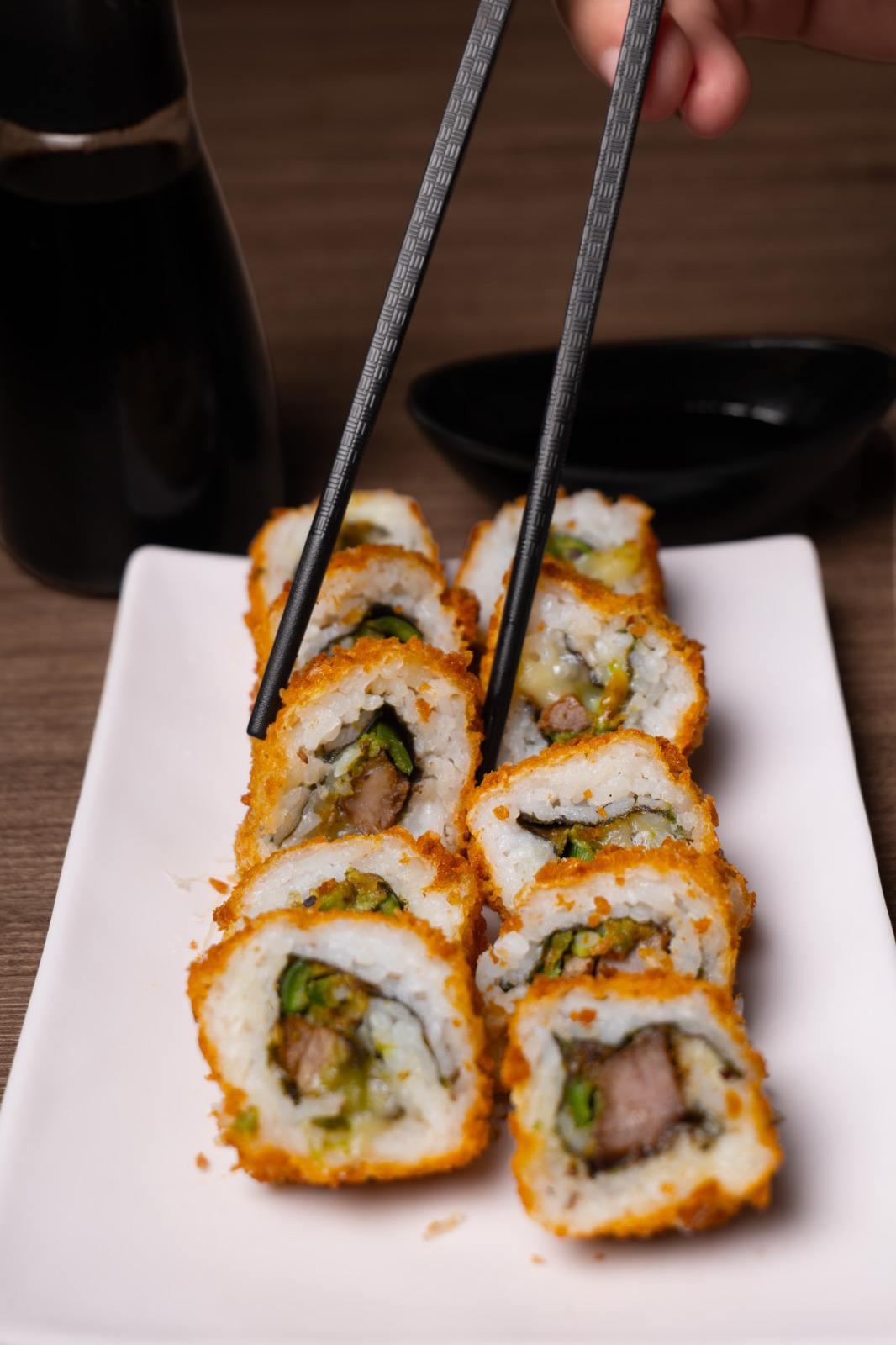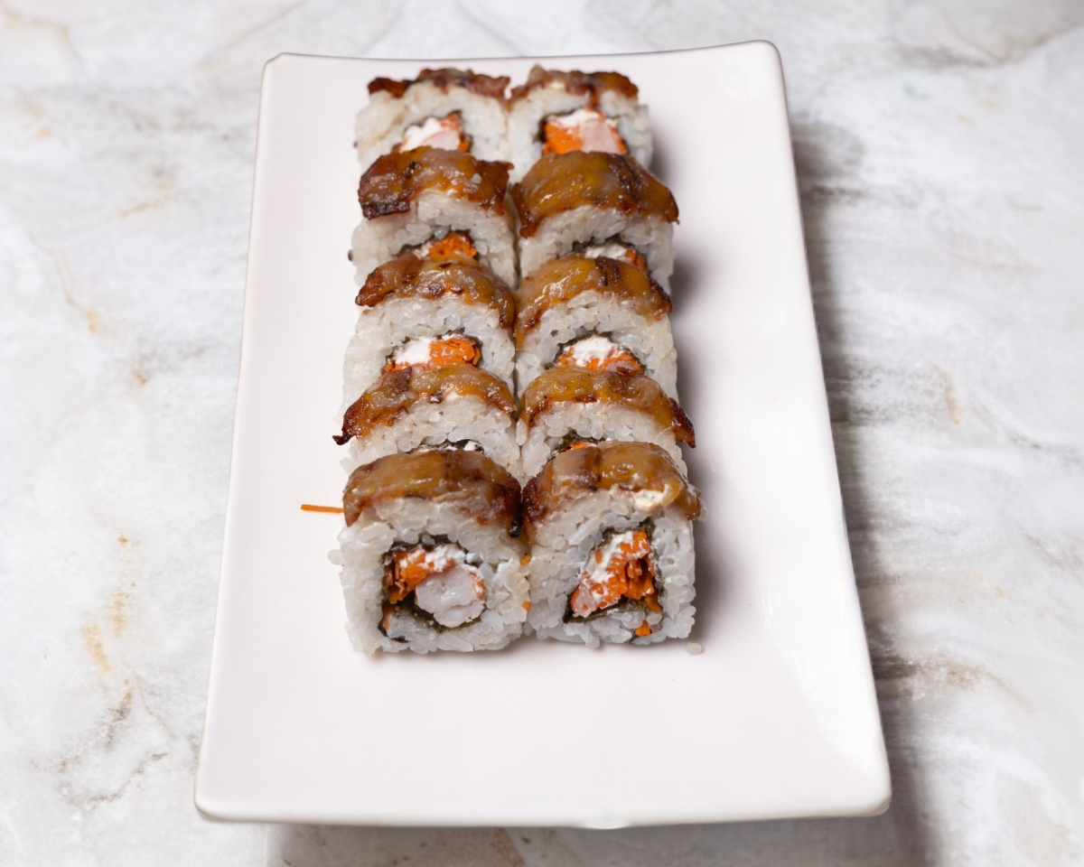 Queso crema, camarones y pepino. Por fuera empanizado.