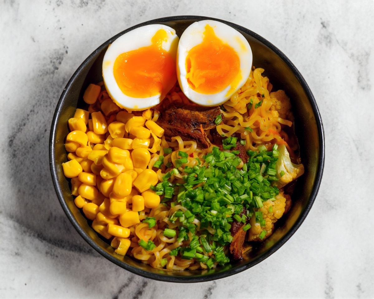Ramen de res acompañado de carne de res, maíz, cebollín, huevo ramen, brócoli y coliflor.