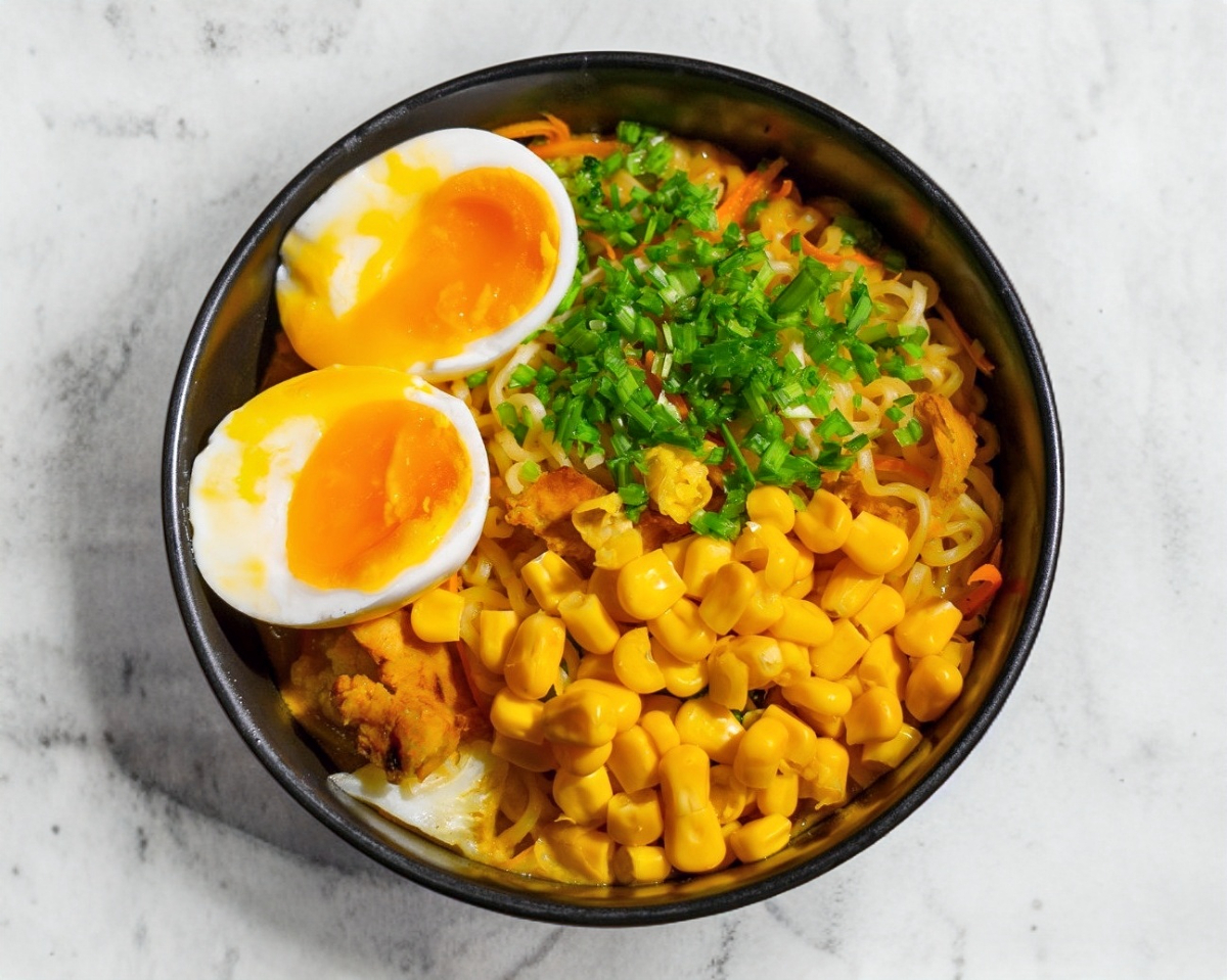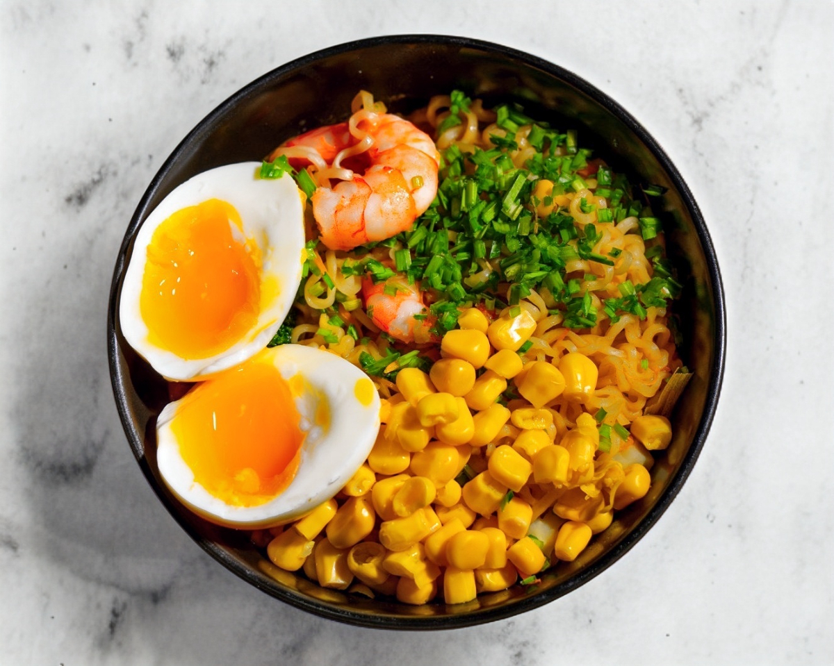 Ramen de camaron acompañado de camarones, maíz, cebollín, huevo ramen, brócoli y coliflor.