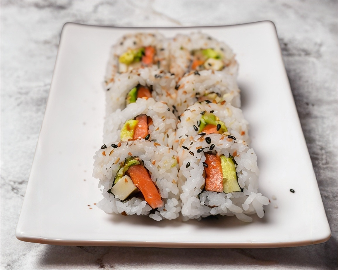 Pd: salmón, camarones, queso crema, pepino. Pf: furikake.