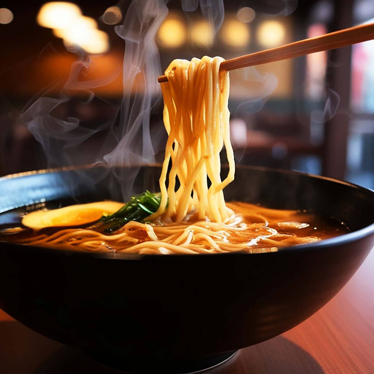 Fideos gruesos en caldo de pollo, hondashi y miso picante. Contiene aceite de ajo, camarones, surimi, pulpo, champiñones, cebollín, ají, ajonjolí, naruto y alga nori.