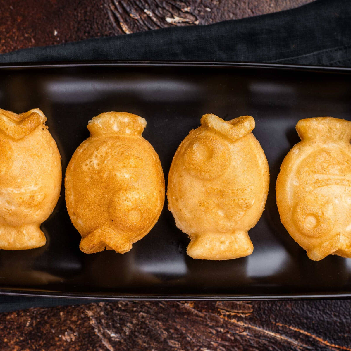 Par de waffles japoneses en forma de pez, rellenos de crema pastelera (vainilla, fresa, chocolate) o nutella. Crema batida y cereza.