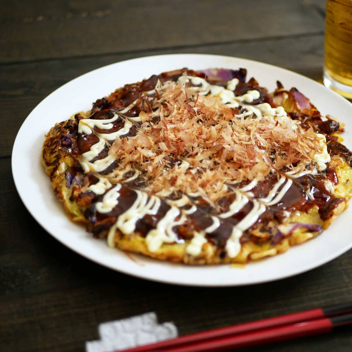Panqué japonés mezclado con repollo, salchicha, surimi, tocino frito, jengibre curtido, salsa BBQ especial, red de mayonesa, alga en polvo y hanakatsuo (hojuelas de bonito).