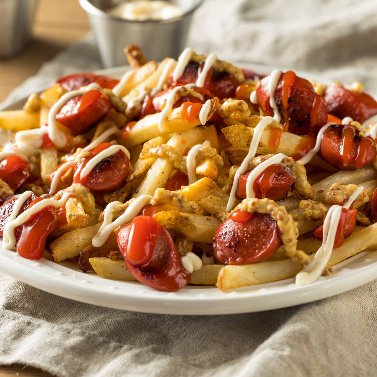 Mezcla de papas fritas y salchipulpos salteados con especias de la casa. Acompañan salsas BBQ, mostaza y ketchup.