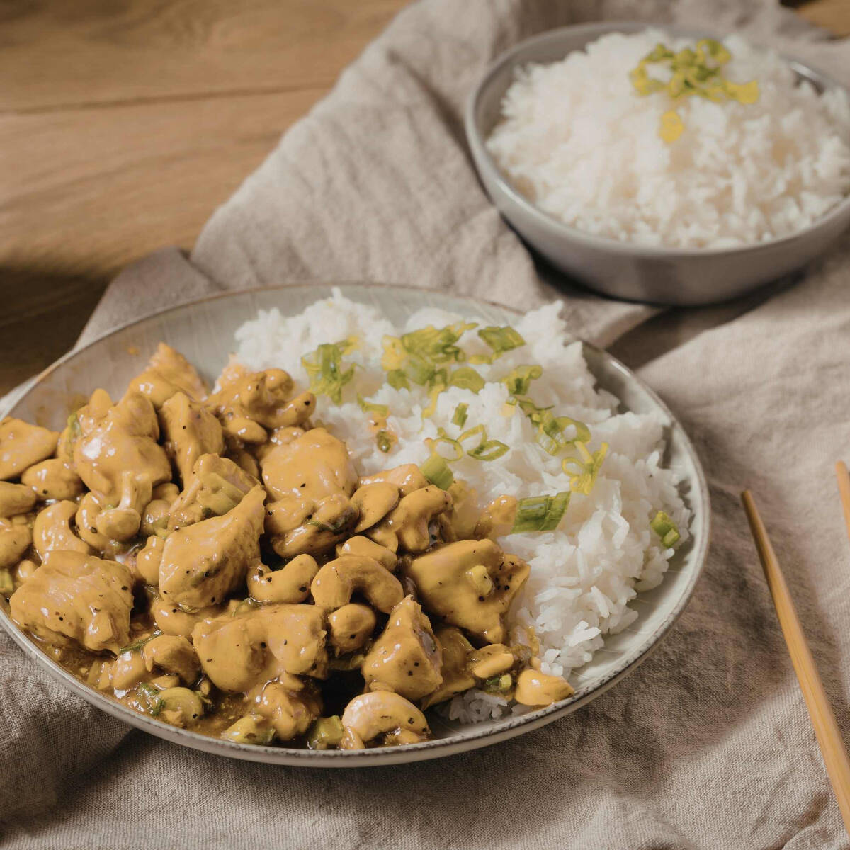 Pasta de curry (receta de la casa) con vegetales y pollo, acompañada de arroz blanco.