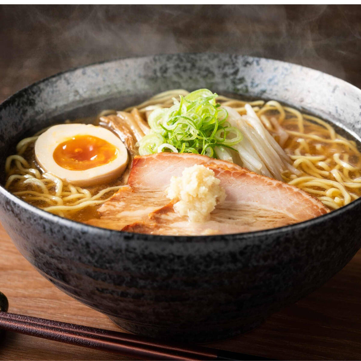 Caldo base de pollo y hondashi con aceite de ajo. Acompañan huevo frito, cebollín, carne picada de pollo, champiñones y alga en polvo.