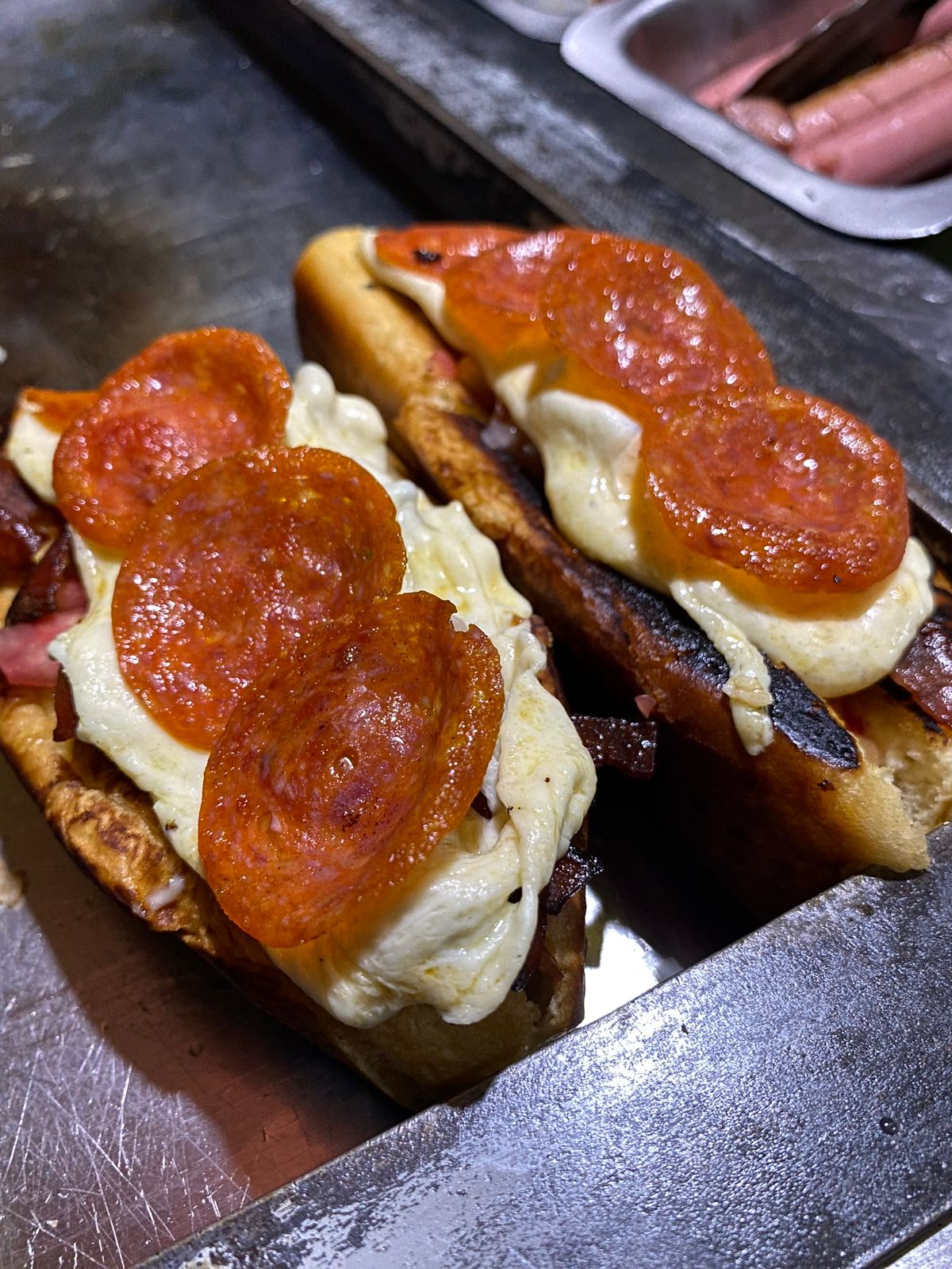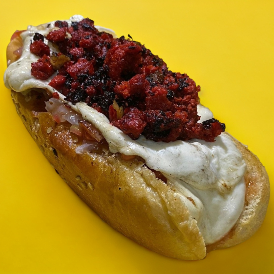 Tomate, cebolla, catsup, mostaza, tocineta y quesillo