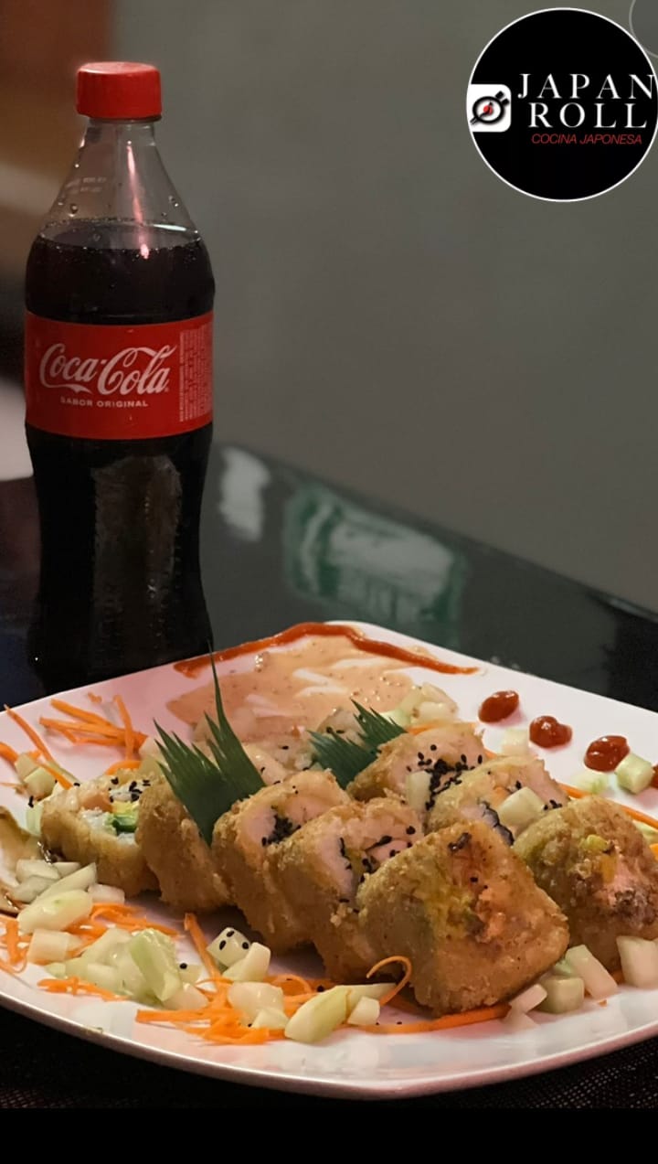 Camarón empanizado por dentro aguacate, pepino, zanahoria y queso gouda por dentro.