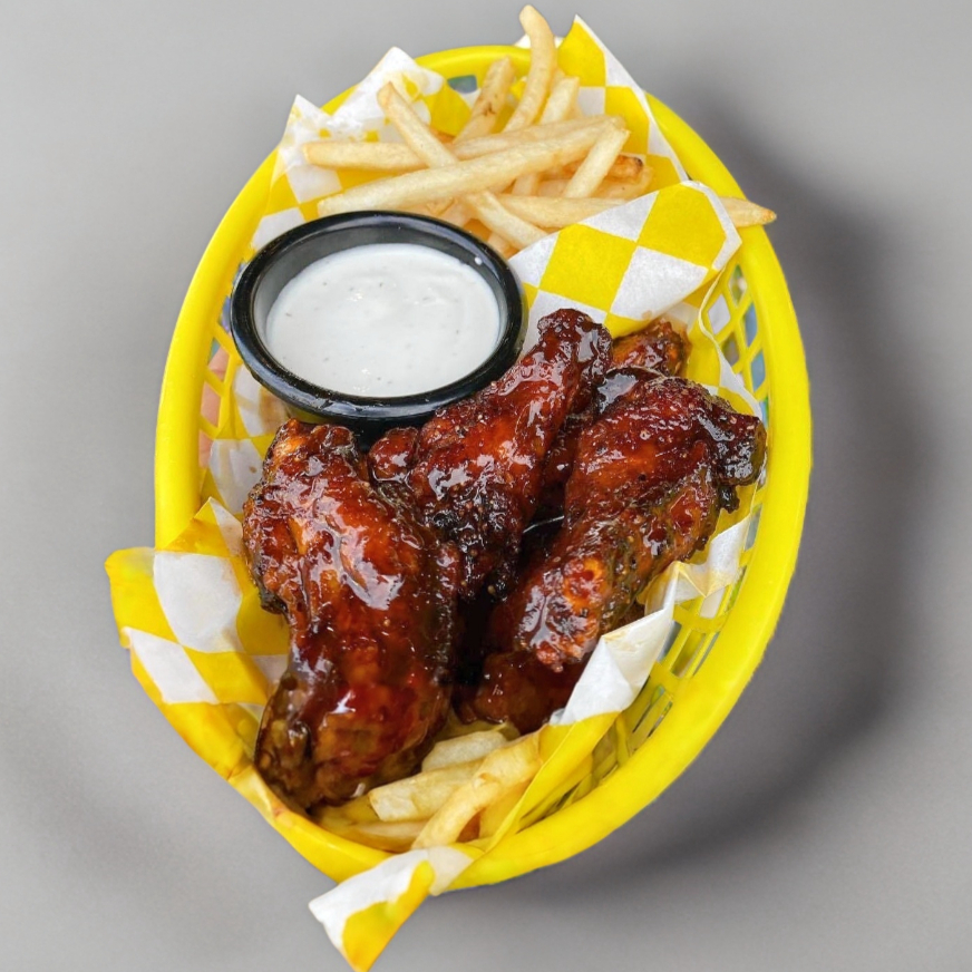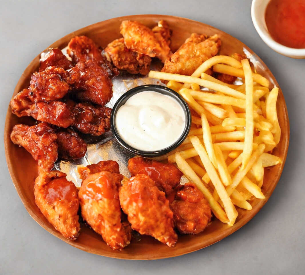 250 Gramos de boneless. 8 aros de cebolla, 6 bombas de queso y 1 papas con queso y tocino