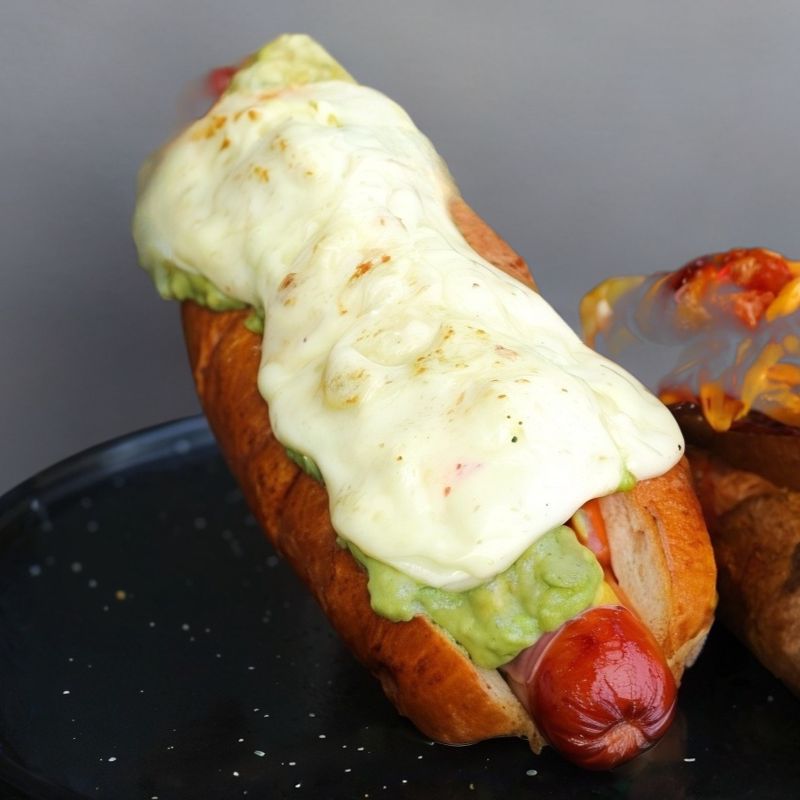 Salchicha de res jumbo con nuestro rico pan artesanal, guacamole, queso de hebra fundido, tomate, cebolla, chiles, catsup, mayonesa y mostaza.