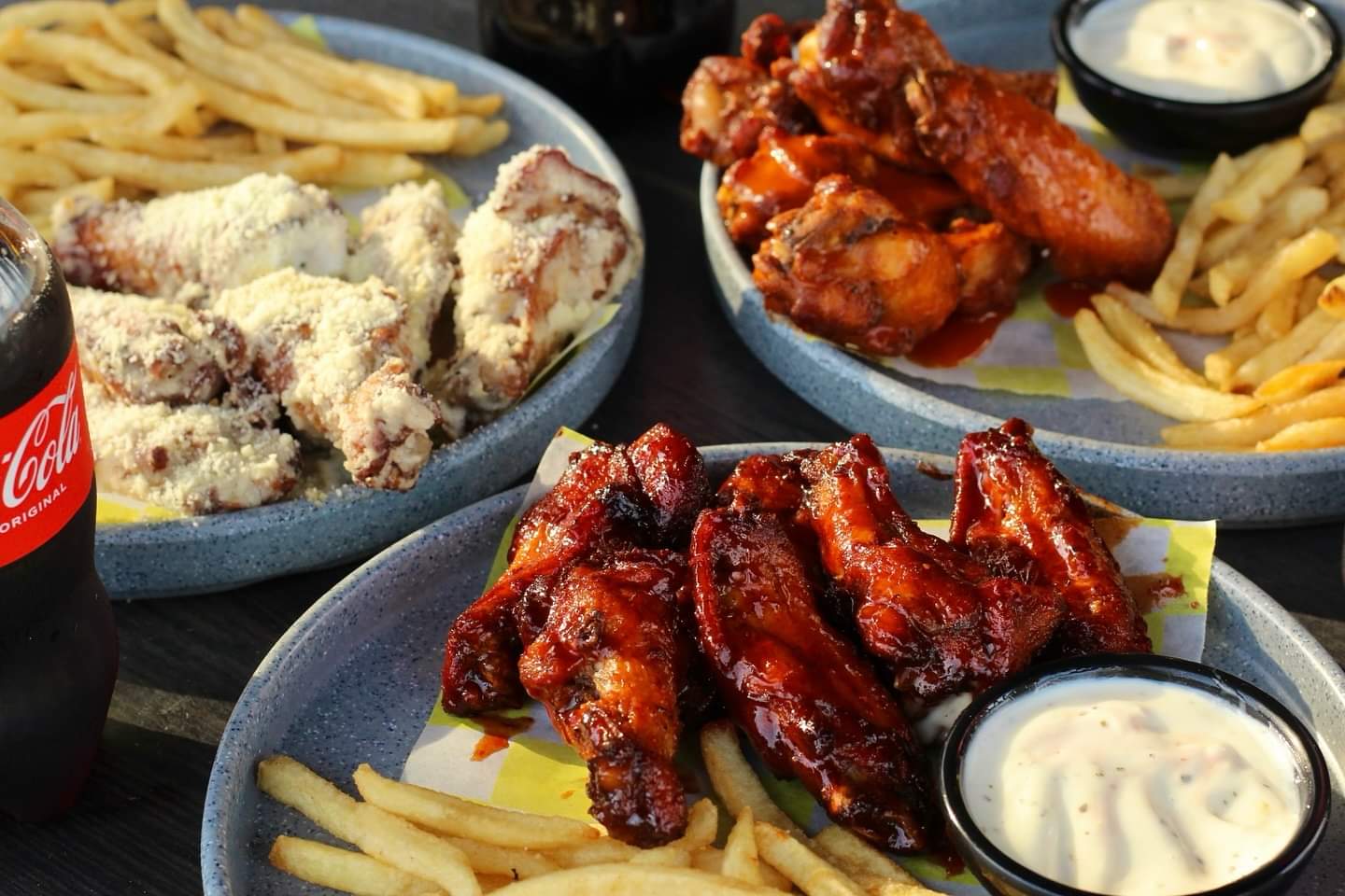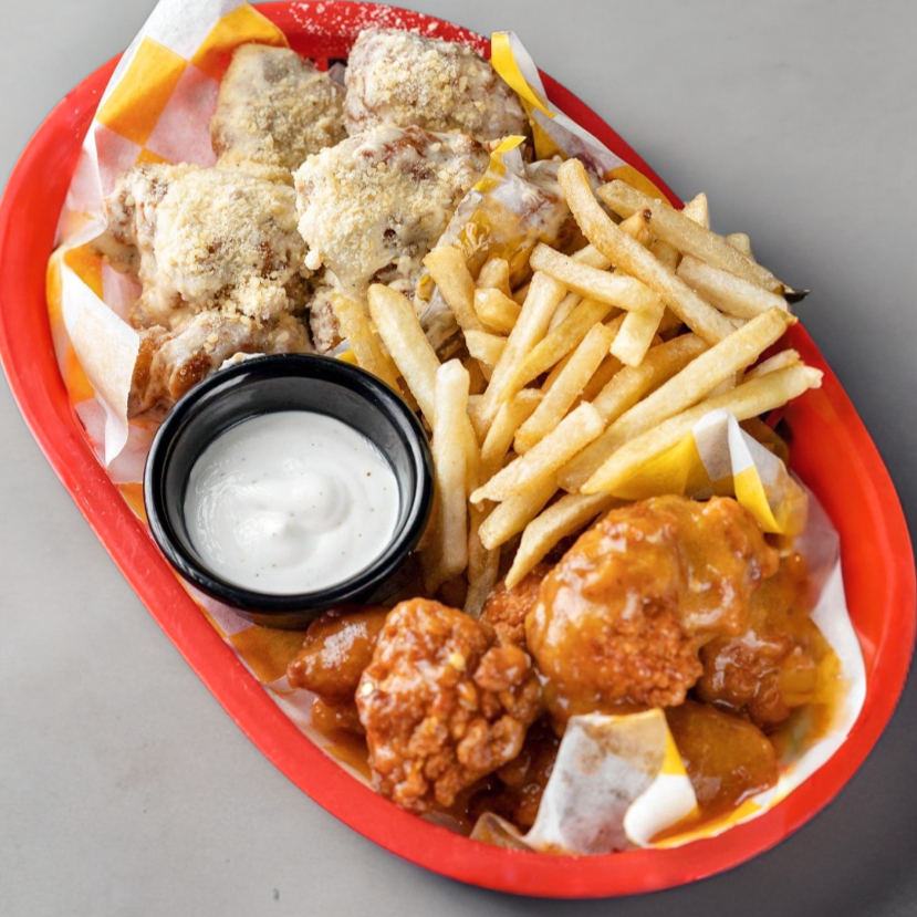 De lo bueno, todo. Boneless (6), bombas de queso (3), aros de cebolla (5), papas con queso y tocino (200 g), acompañados de salsa italiana y blue chesse.