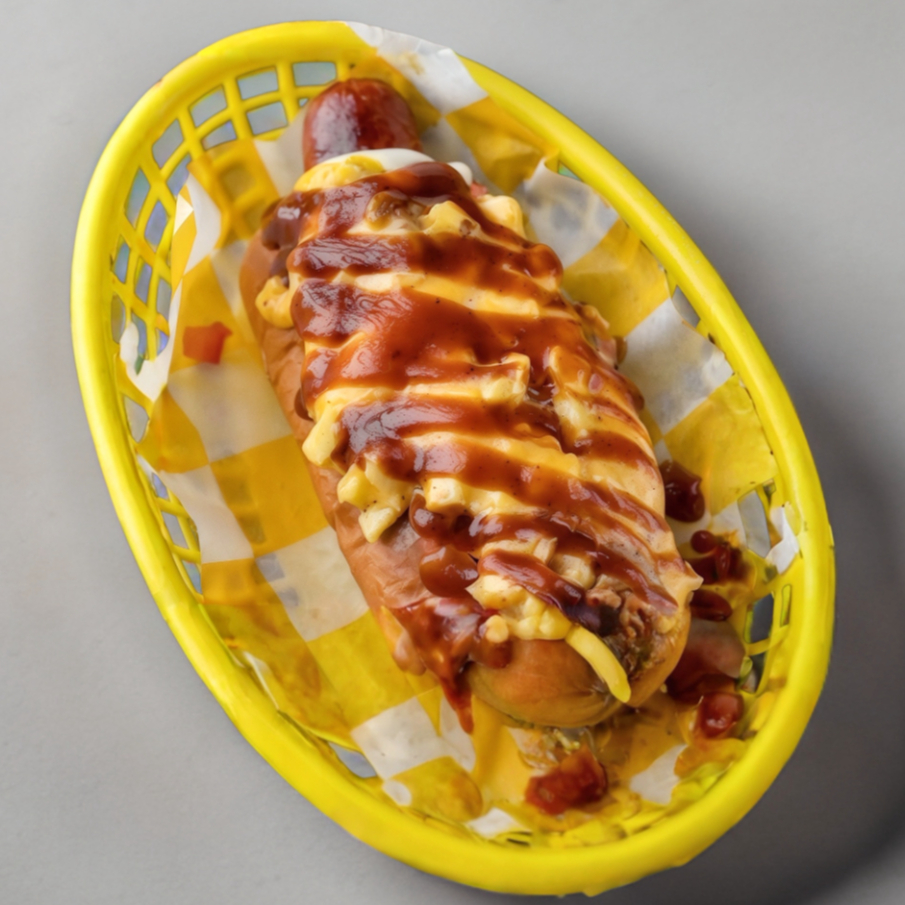 Incluye papas. Salchicha de res jumbo con nuestro pan artesanal, queso cheddar, piña, bbq tomate, cebolla, chile y aderezos. (1 pieza)