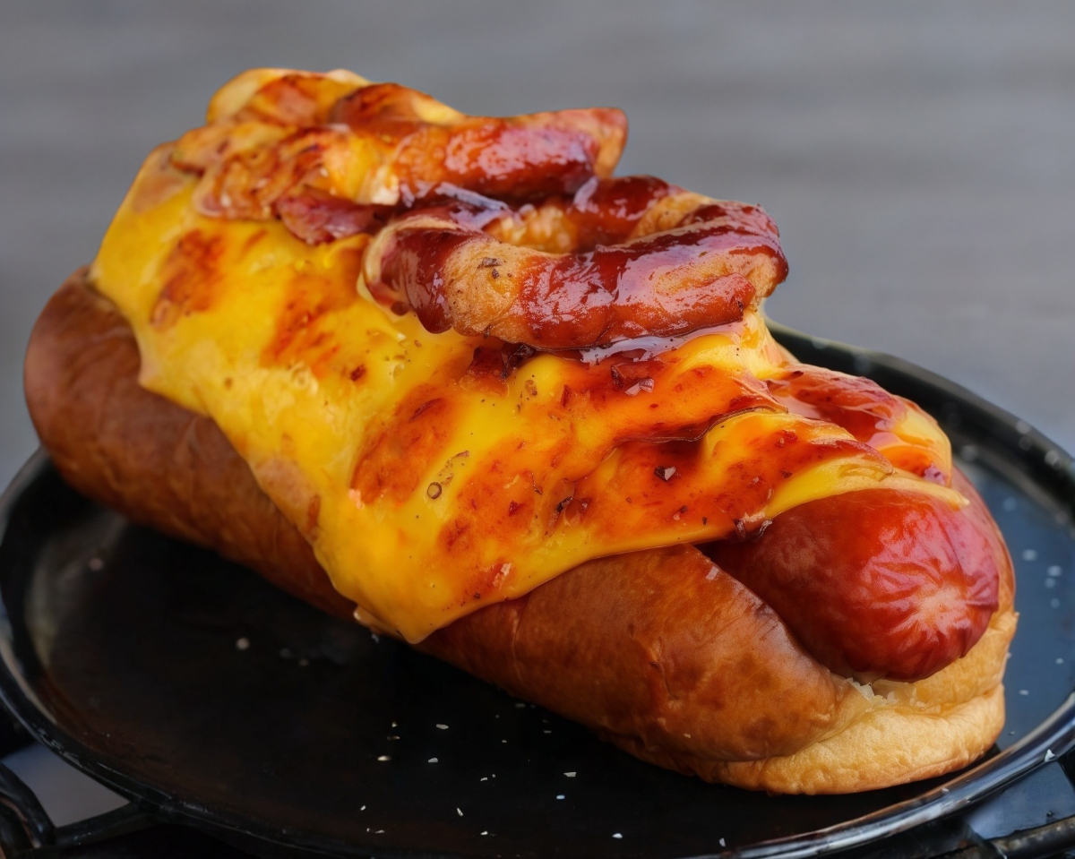 Salchicha de res jumbo con nuestro rico pan artesanal, tocino, champiñones, queso de hebra fundido, tomate, cebolla, chiles, catsup, mayonesa y mostaza.