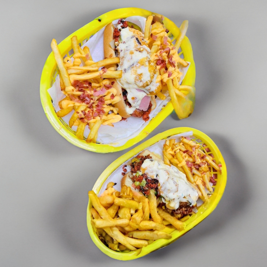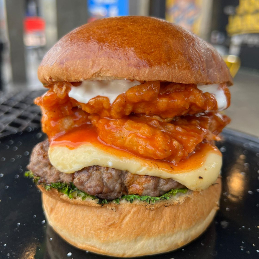 Carne de res, con Crujientes tiras de pollo al estilo cajun bañadas en salsa buffalo y ranch, con queso gouda, lechuga, tomate, cebolla, catsup, mayonesa y mostaza.
