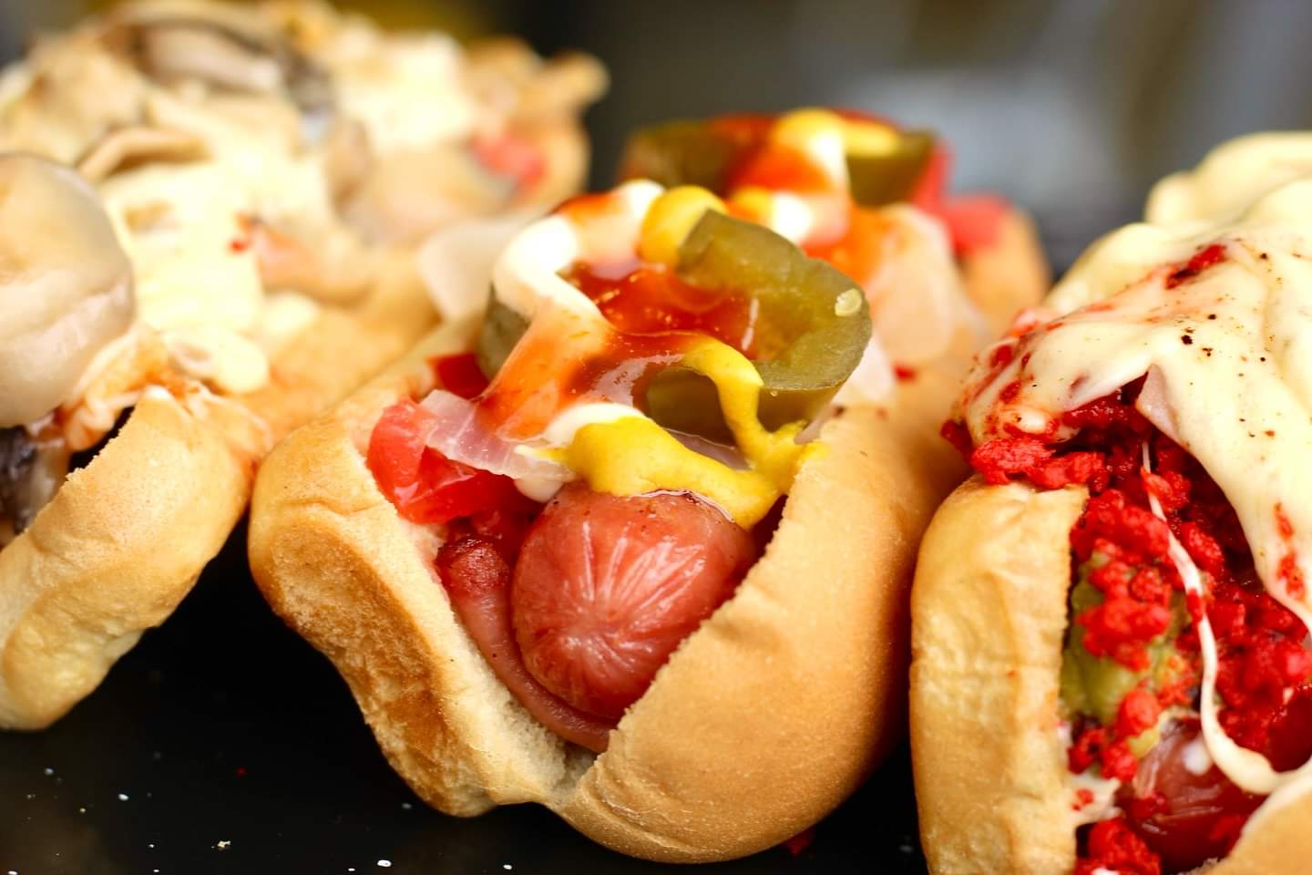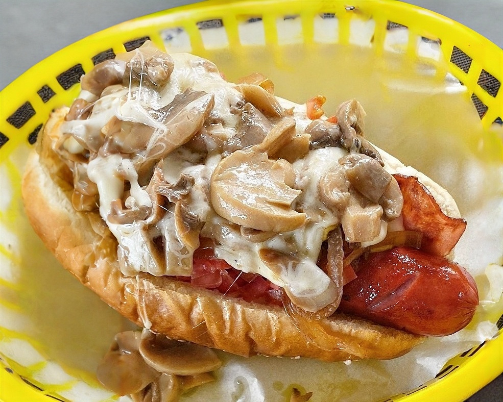 Salchicha de pavo, tocino, champiñones, tomate, cebolla, chiles jalapeños y queso de hebra fundido. Catsup, mayonesa, mostaza.