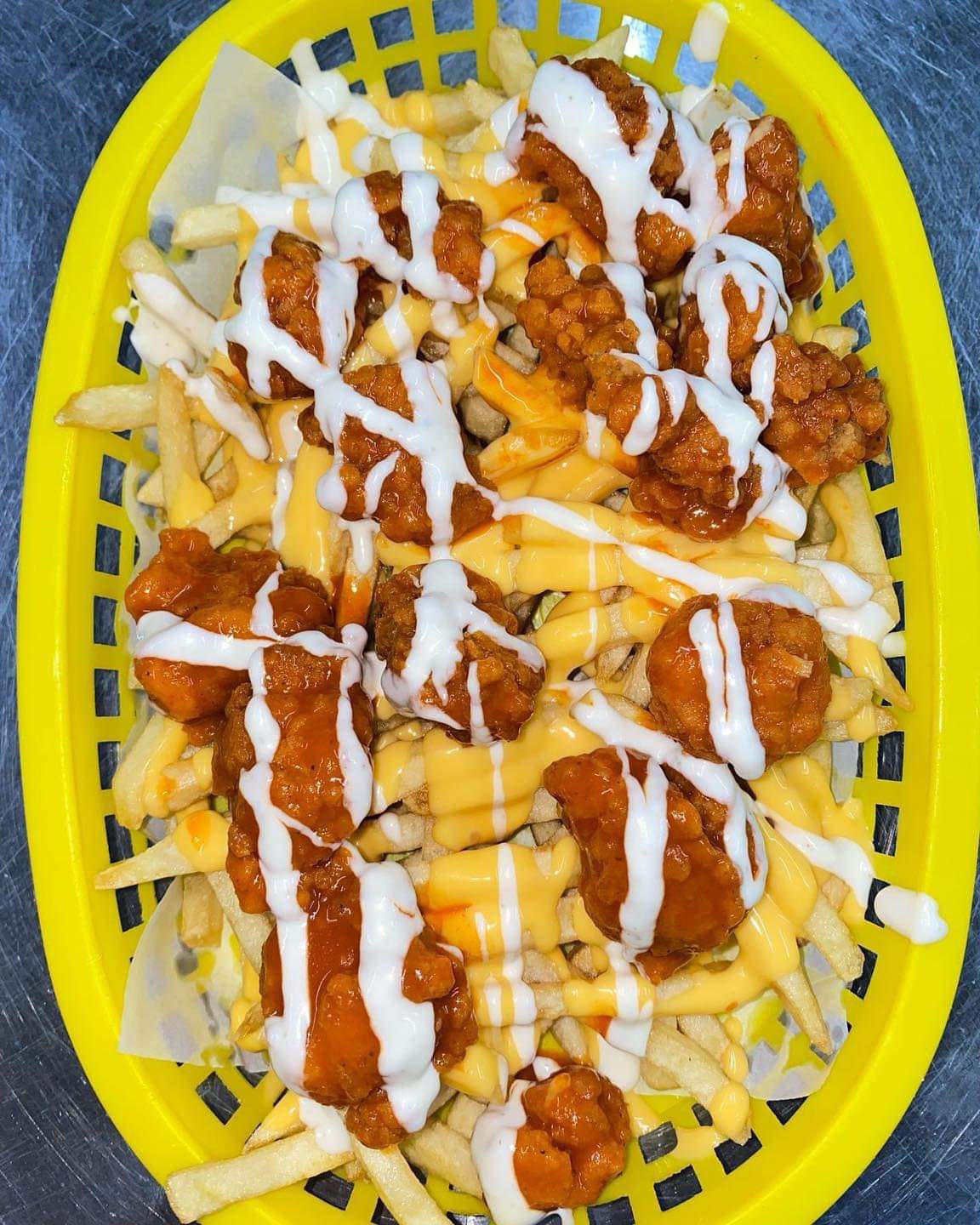 300 gramos de papas a la francesa con queso cheddar, con trocitos de boneless bañados en bufalo y blue cheese