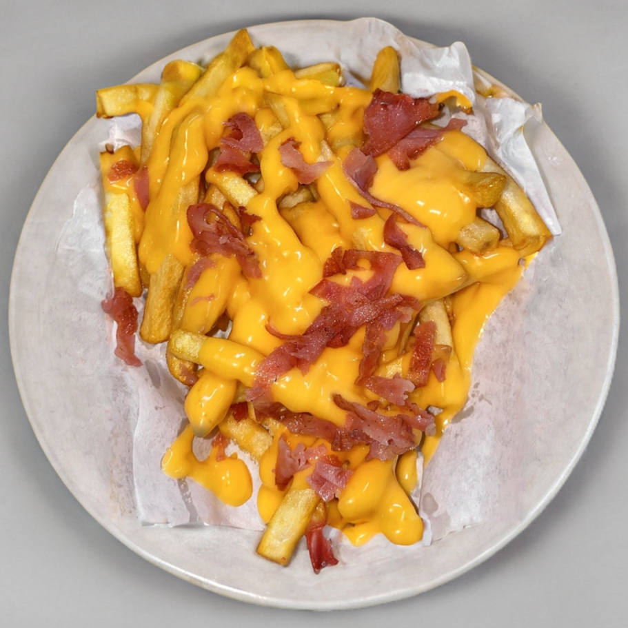 Crujientes papas a la francesa de corte delgado con quesocheddar y trocitos de tocino, ¡deliciosas!. 200 g.
