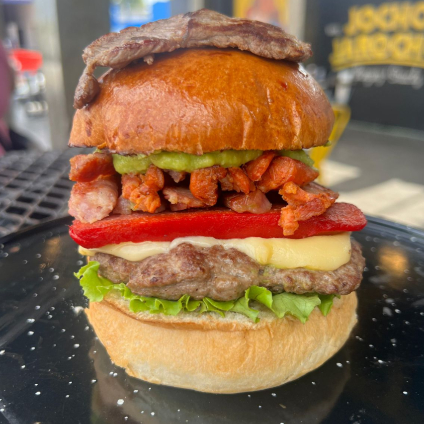 Carne de res, chistorra, chorizo argentino, salchicha para asar, guacamole, queso gouda, coronandolo con un bistec de sirloin, con su respectiva lechuga, tomate, cebolla, catsup, mayonesa y mostaza.