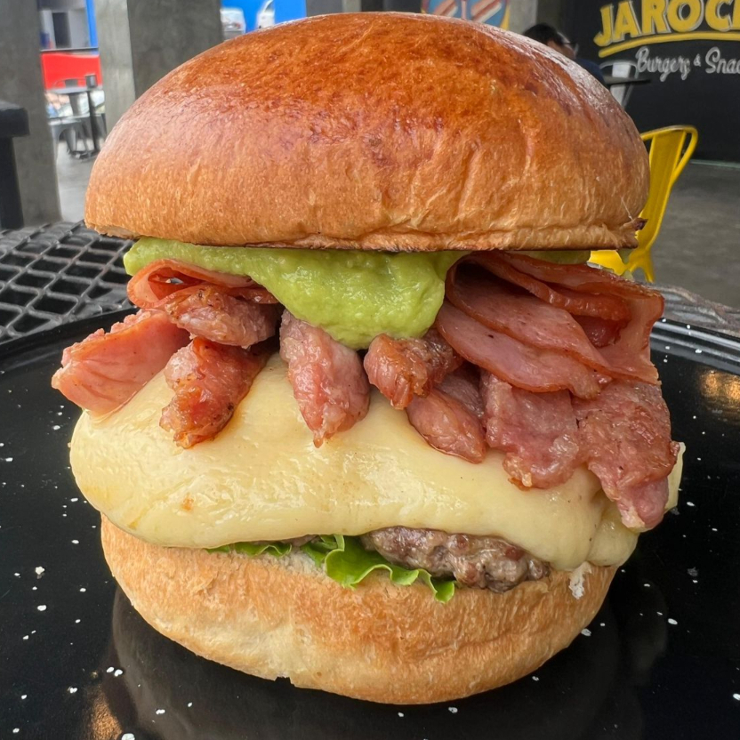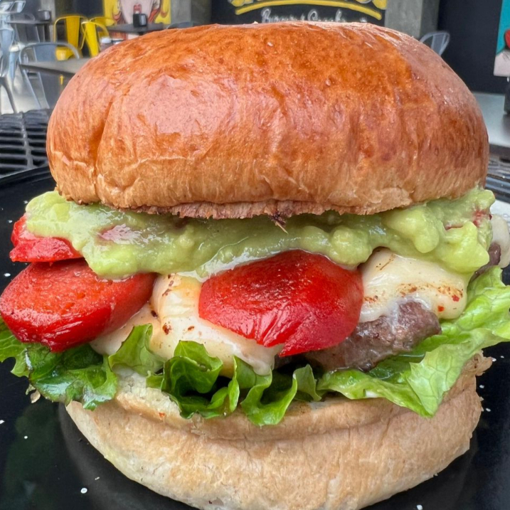Carne de res, chorizo argentino, guacamole, tocino, queso gouda, lechuga, tomate, cebolla, catsup, mayonesa y mostaza.
