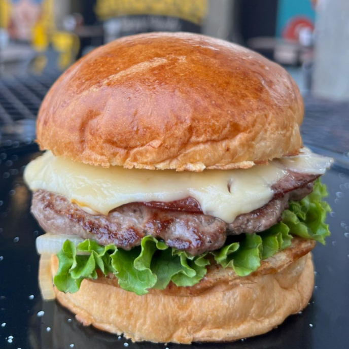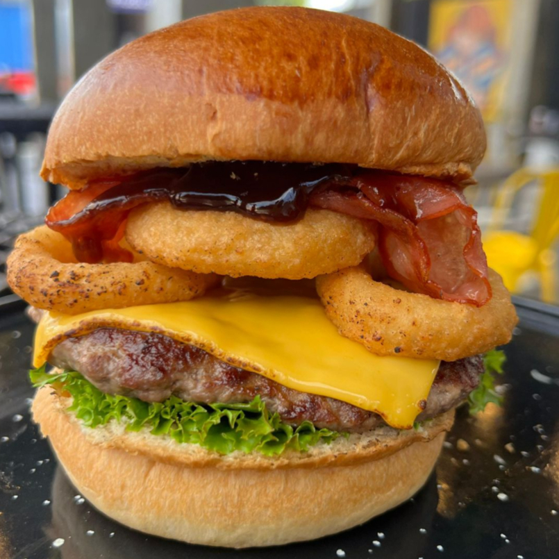 Carne de res, 3 aros de cebolla, queso cheddar, crujientes tocinos, aderezo jack daniels (bbq), lechuga, tomate, cebolla, catsup, mayonesa y mostaza.