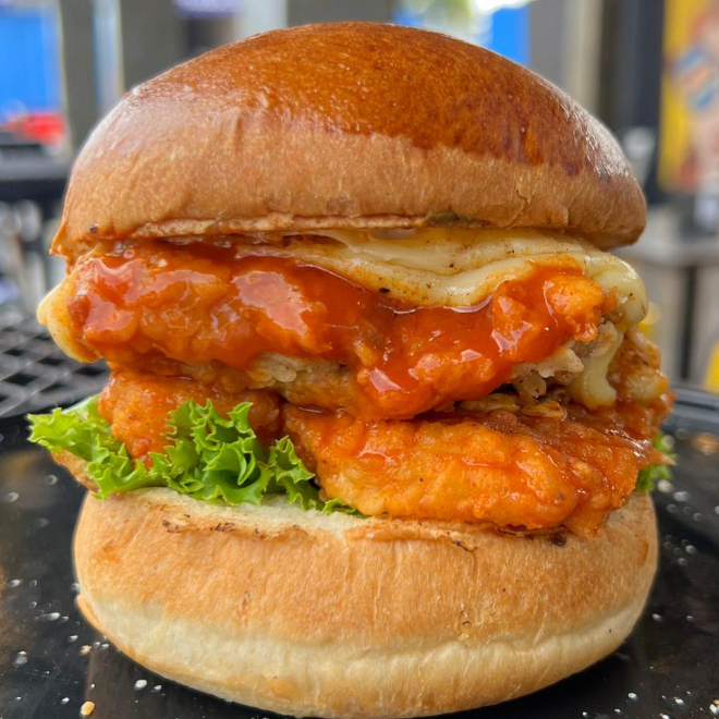 Crujientes tiras de pollo al estilo cajun bañados en salsa bufalo y ranch, cubierta con queso gouda, lechuga, tomate, cebolla, catsup, mayonesa y mostaza.