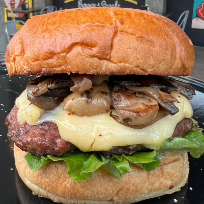 Carne de res, champiñones, queso gouda, lechuga, tomate, cebolla, catsup, mayonesa y mostaza.