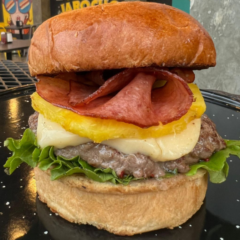 Carne de res, piña, tocino, bbq, queso gouda, lechuga, tomate, cebolla, catsup, mayonesa y mostaza.