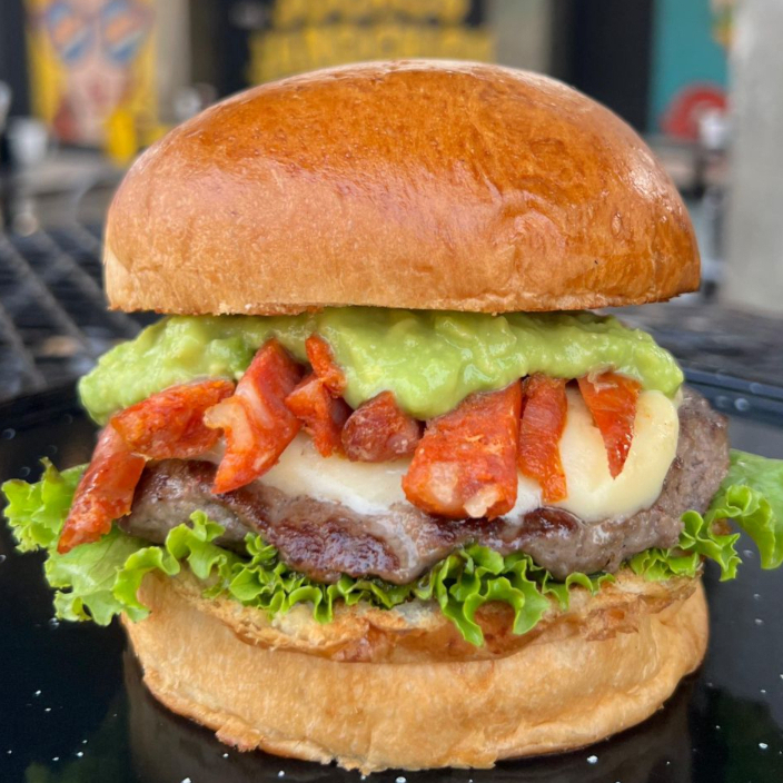 Carne de res, chistorra, guacamole, queso gouda, lechuga, tomate, cebolla, catsup, mayonesa y mostaza.