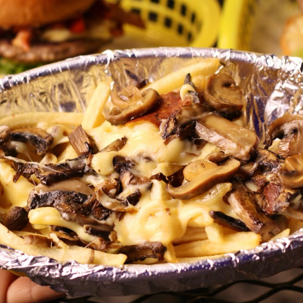 200 gramos de papas a la francesa con queso gouda gratinado con champiñones