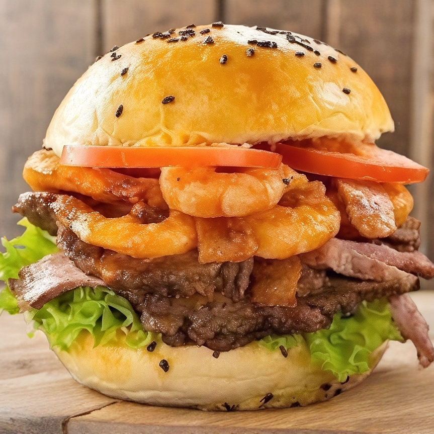 Hamburguesa de res, quesillo, tocino y camarones