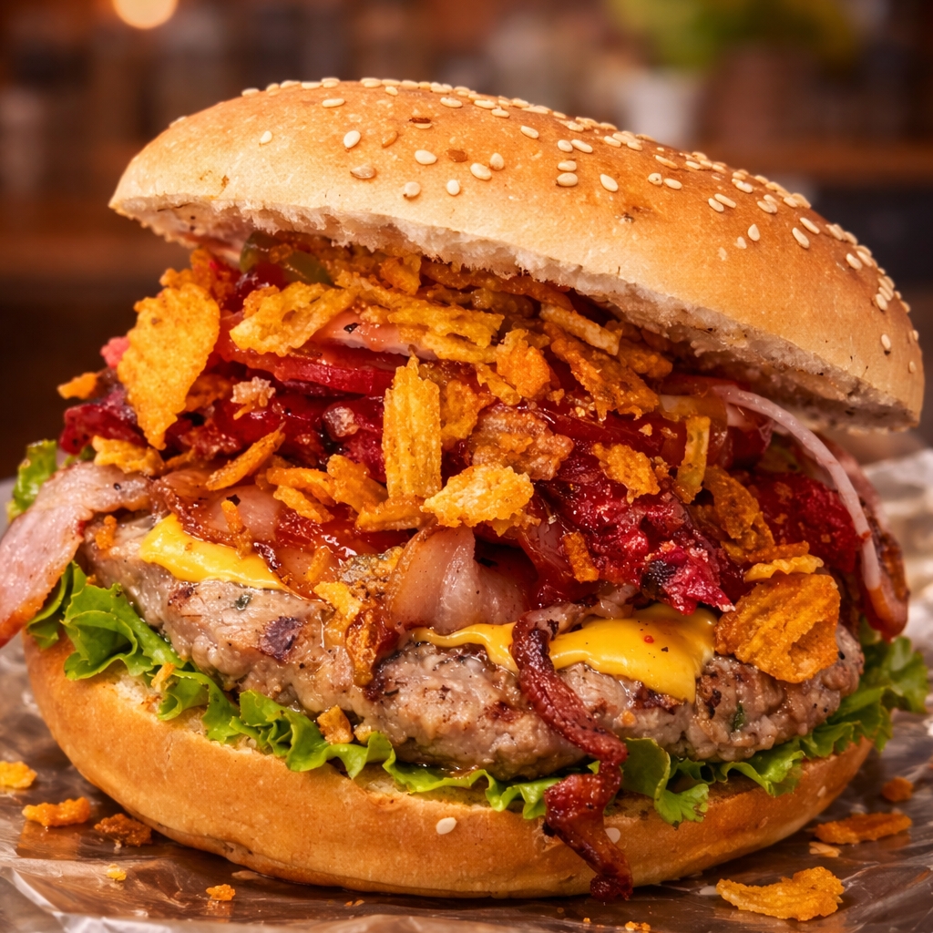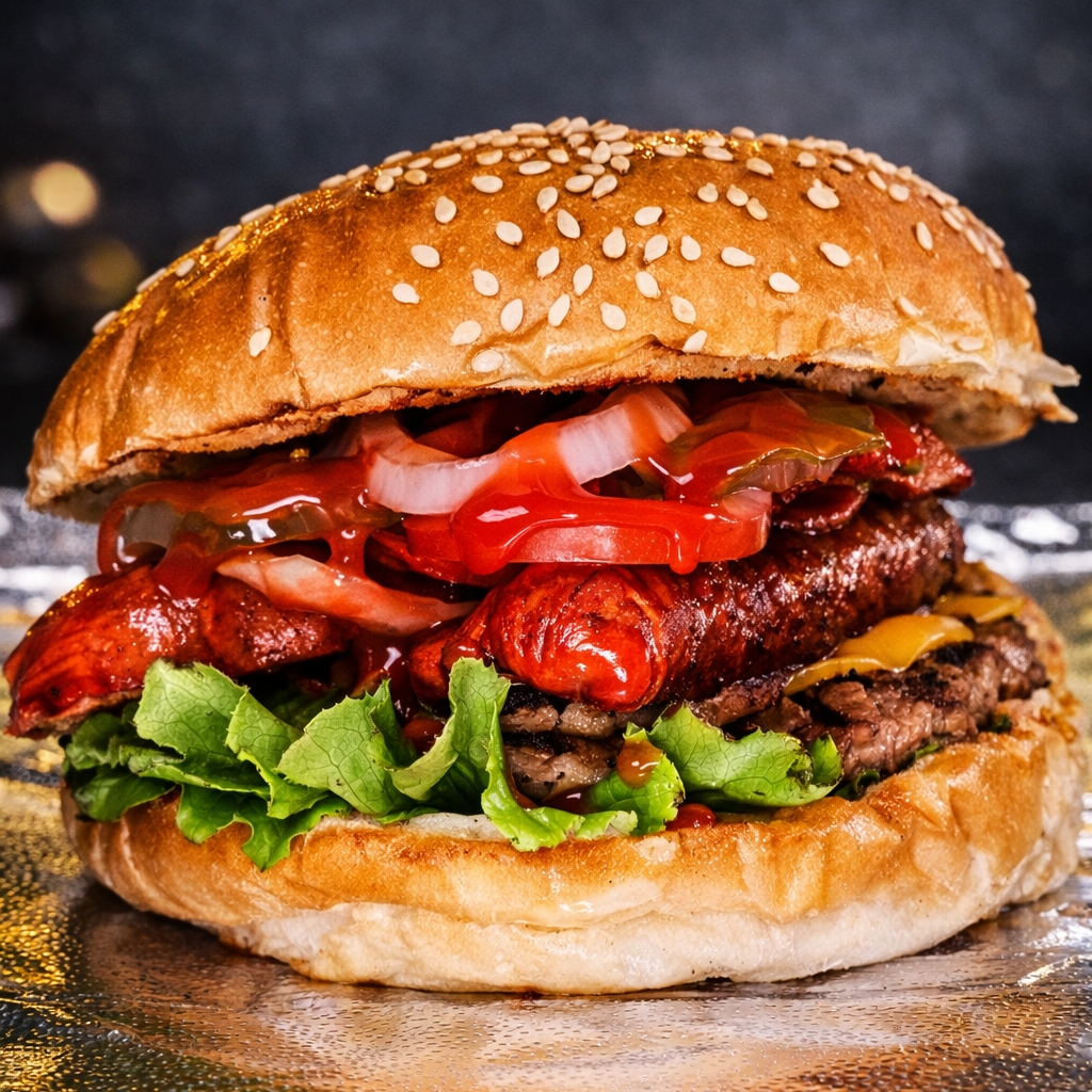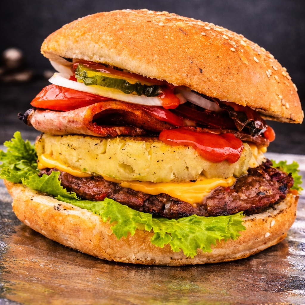Hamburguesa de Res, doble queso Americano, tocino, cebolla, pepinillos, mostaza y catsup