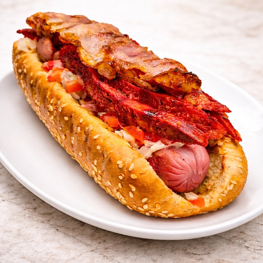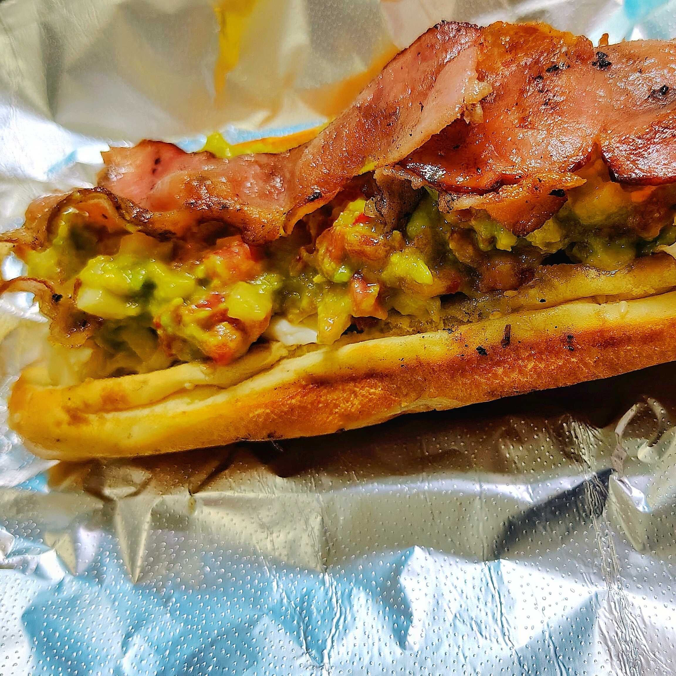 Salchicha, tocino, guacamole y quesillo.