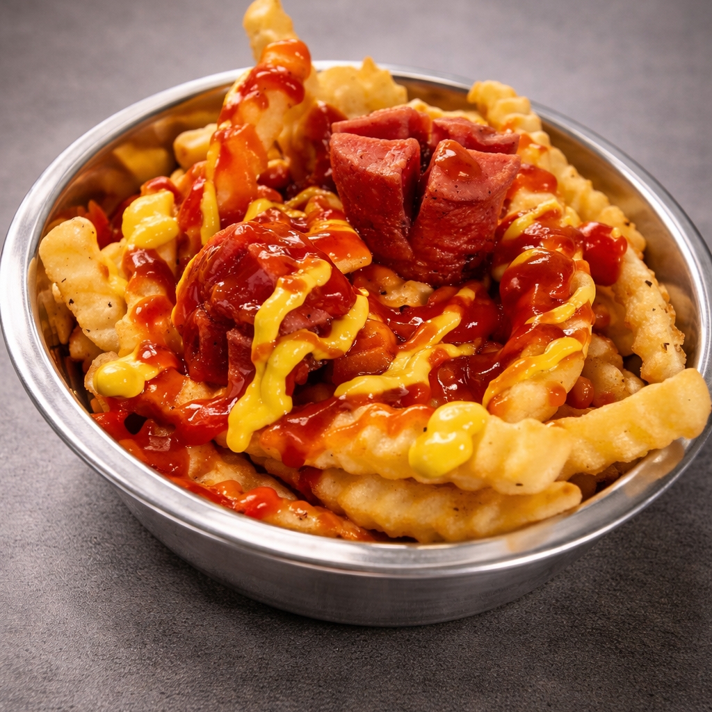 Papas a la francesa con salchichas fritas aderezado con catsup, mostaza, salsa valentina, sal y limon